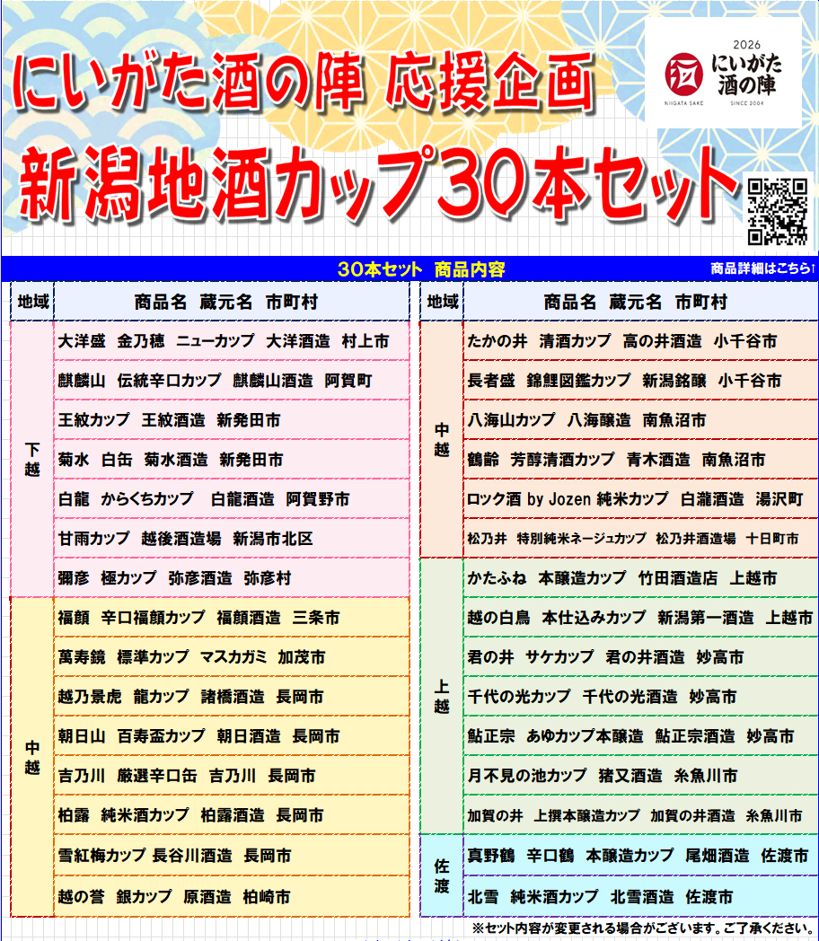 2026年1月21日 / 最終更新日時 : 2026年1月21日 大坂 酒店 お知らせ 今年も発売決定! 2月中旬より発送開始。予約受付中です。例年大変ご好評!!「にいがた地酒カップ30本セット」が今年も発売です。内容は新潟県の上中下越佐渡からバランスよく選んだ30蔵元のカップ酒と、新潟県酒造組合の蔵元紹介パンフレットをセットにさせていただきました。「にいがた酒の陣」に参加できない方にも、多くの蔵元の味わいが楽しめる、おうちで「にいがた酒の陣」を楽しんでいただけるような内容となっております。贈答品としても最適です。